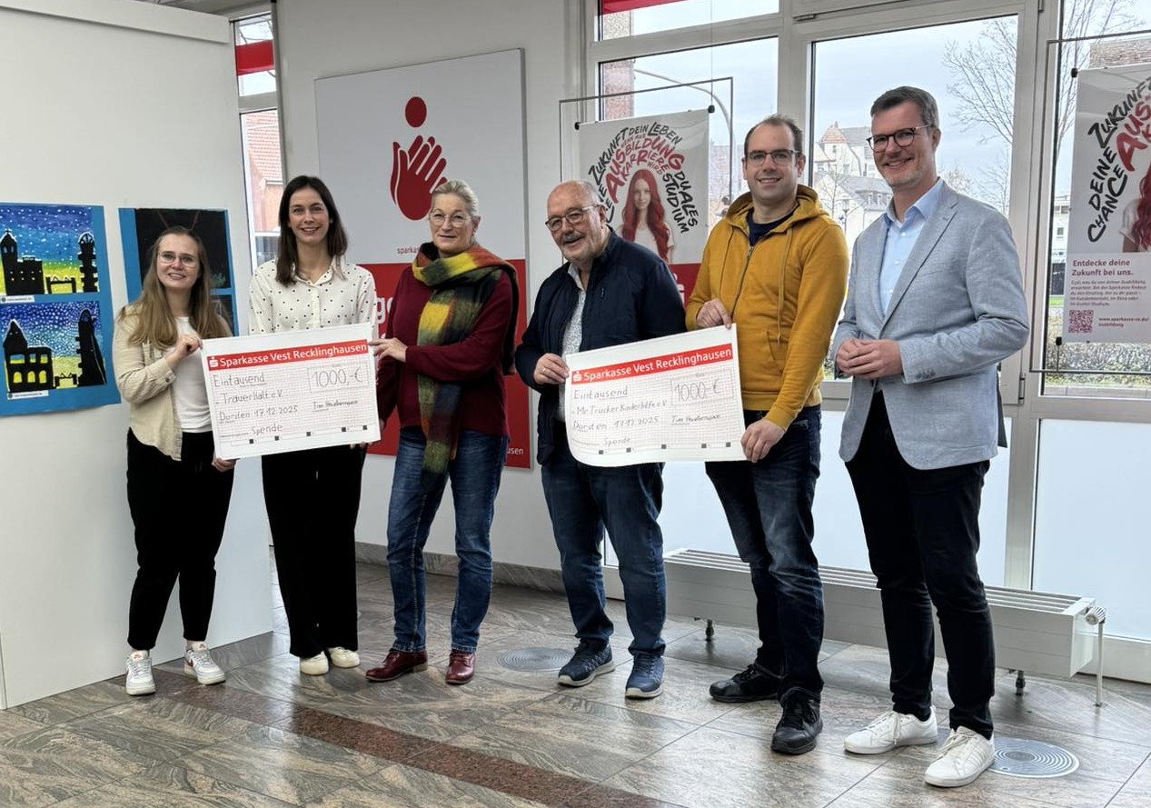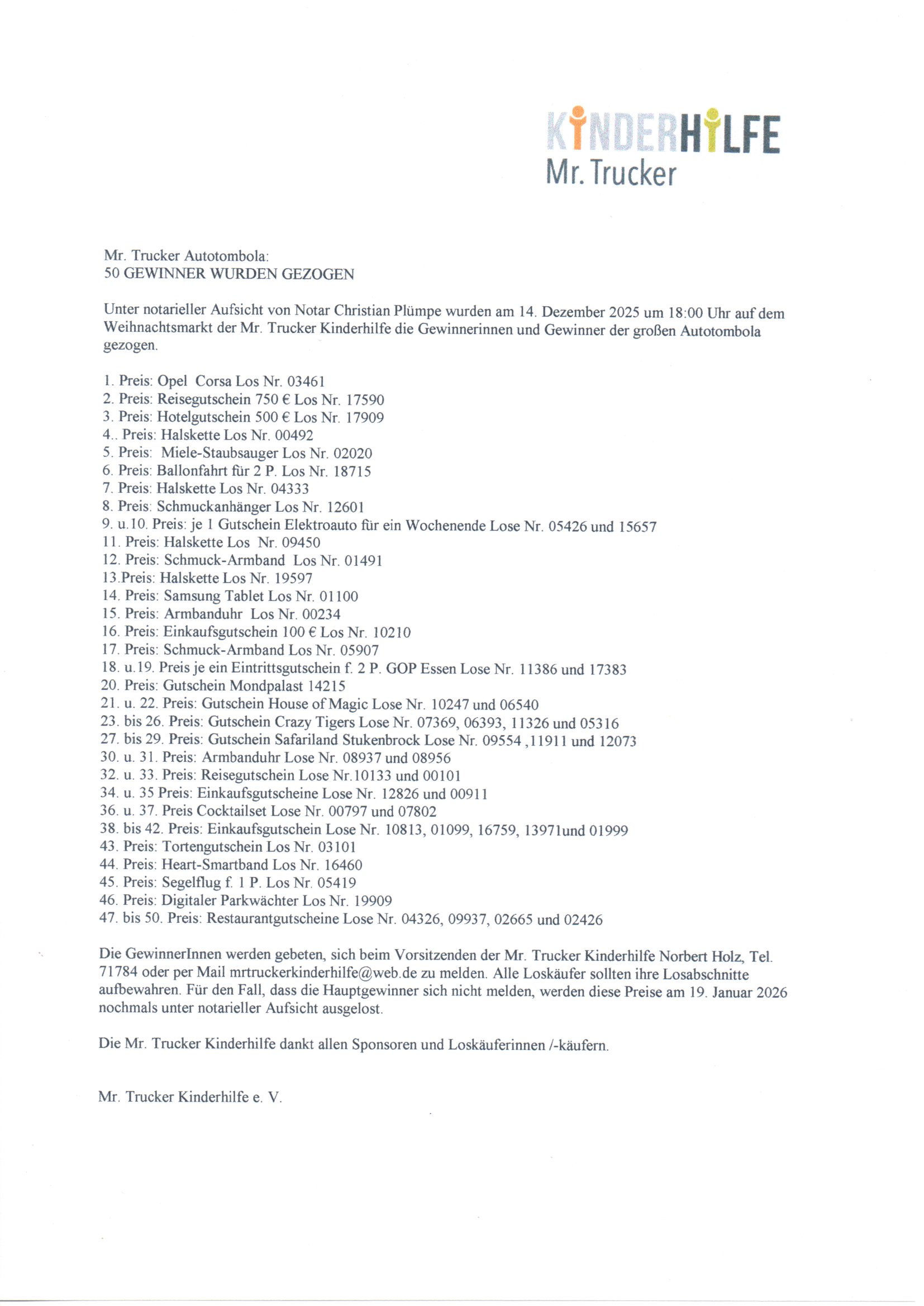 Eine tolle Weihnachtsüberraschung erlebten Christel und Klaus Ansperger aus Dorsten. Sie hatten bei der Autotombola 2024 den Hauptpreis - einen Opel Corsa - gewonnen. Das Los hatten sie im Kindergarten Arche gekauft, wo Christel Ansperger 23 Jahre lang Leiterin war. Im Tausch gegen das Gewinnlos mit der Nr. 3422 erhielten die Gewinner den Autoschlüssel vom Vorsitzenden der Mr. Trucker Kinderhilfe, Norbert Holz. Im Bild v. l. n. r. Dennis Woltsche, Schatzmeister Mr. Trucker Kinderhilfe, Hans-Peter Mast, Autohaus Borgmann, Sabine Mittermayr, 2. Vorsitzende Mr. Trucker Kinderhilfe, Jörg Borgmann, Klaus und Christel Ansperger, Norbert Holz und Tanja Wilkin, jetzige Leiterin der KiTa Arche (sie hatte das Glückslos verkauft). Herzlichen Glückwunsch und allzeit gute Fahrt.