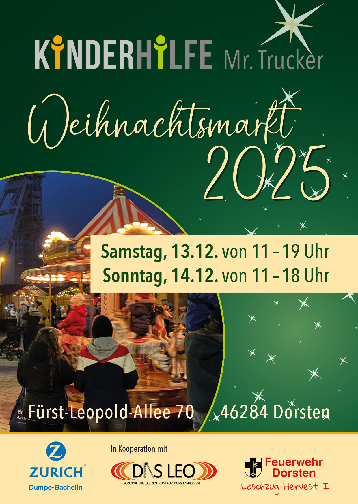 Auch in diesem Jahr veranstaltet die Mr. Trucker Kinderhilfe eine große Autotombola. Hauptgewinn ist ein Opel Corsa (Tageszulassung). Zudem gibt es mehr als 40 attraktive Preise zu gewinnen, z.B. einen Reisegutschein über 750 €, einen Hotelgutschein im Wert von 500 €, eine Ballonfahrt für 2 Personen, ein Tablet, einen Outfitgutschein im Wert von 300 € und Sachpreise wie Schmucküberraschungen und Restaurant- und Einkaufsgutscheine. Ein Los kostet 2 €. Lose können an vielen Vorverkaufsstellen in Dorsten erworben werden und natürlich auf dem Weihnachtsmarkt, der am 14. / 15. Dezember rund um DAS LEO im ehemaligen Zechengelände stattfindet. Die Ziehung der Gewinnzahlen erfolgt am 15. 12. 2024 um 18:00 Uhr auf dem Weihnachtsmarkt. Die Gewinnzahlen werden hier im Internet, bei Facebook sowie in der Dorstener Zeitung und bei Dorsten Online veröffentlicht.